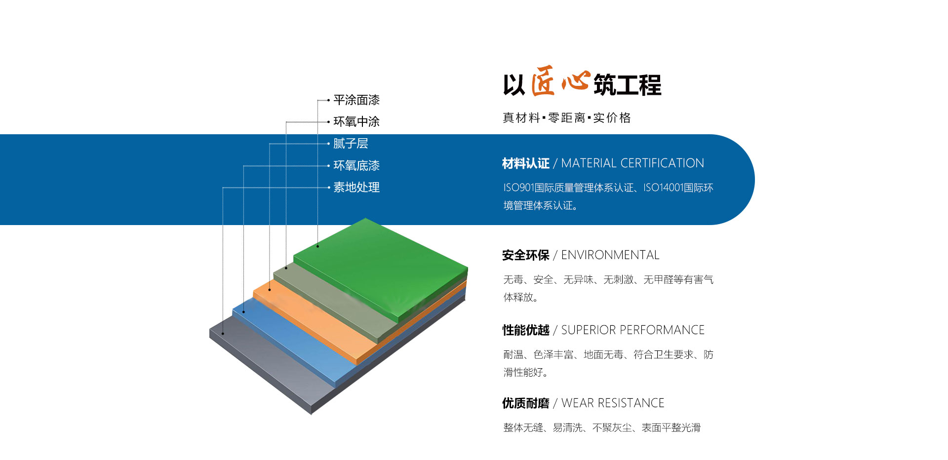 安徽世博裝飾工程有限公司成立于2009年,是一家以外墻涂料、工業地坪設計、施工和銷售為主要的專業性工程公司、是工業地坪施工的專業企業。公司設立了售后服務中心,用戶遍布全國大中小城市,一大批具有標志性的長期合作伙伴。“世博公司”環氧地坪工程,受到了越來越多的不同行業用戶的好評及青睞。公司擁有一批經驗豐富的管理人員和專業的施工人員,以保障產品的成功應用,用較小的代價獲得理想的效果,尤其在地坪涂裝方面優勢突出。而且以好的品質管理模式,向客戶提供“獨具魅力”、“性能優異”、“質量穩定”的產品。公司主要產品包括:平涂型環氧地坪、環氧砂漿地坪、環氧樹脂自流平地坪、滾涂型防靜電地坪、自流平防靜電地坪、復古地坪、水性環氧樹脂地坪、彩色透水混凝土地坪、壓花壓模藝術地坪、金剛砂耐磨硬化地坪、混凝土密封固化劑地坪、乙烯基酯重防腐地坪、GEP 標準型地坪、彈性PU運動場地坪、塑膠跑道地坪,PVC橡膠地板、停車場地坪、無震...